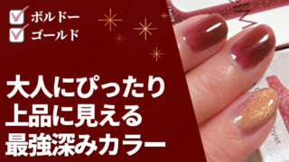 ジェルミーワン「162 チェリースパークル」を30代の大人女性目線でレビュー。深赤×ゴールドラメの上品さ、色味の違い、一度塗り・二度塗りの仕上がりなど実体験ベースで紹介。大人が似合う冬ネイルを探す方におすすめ。